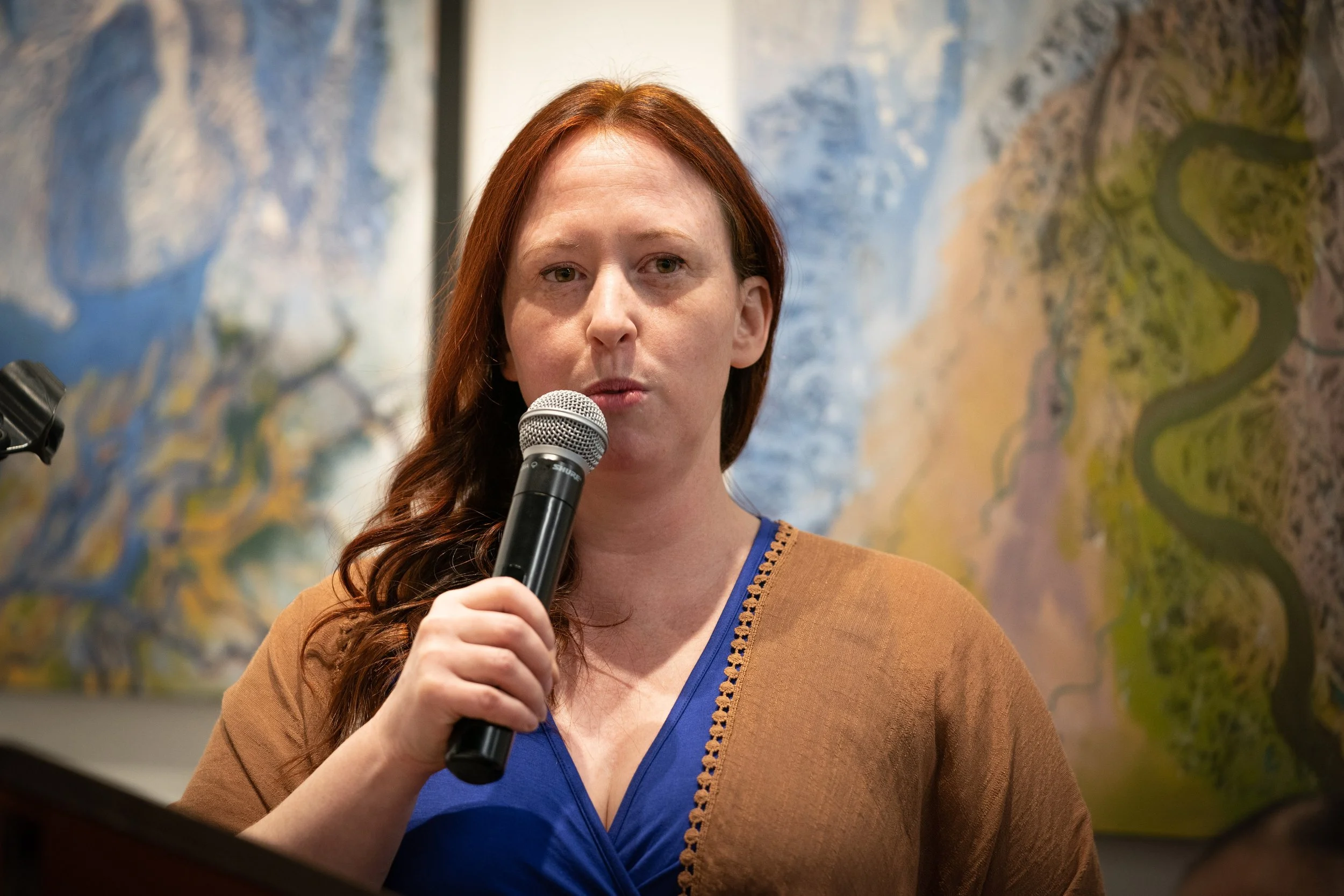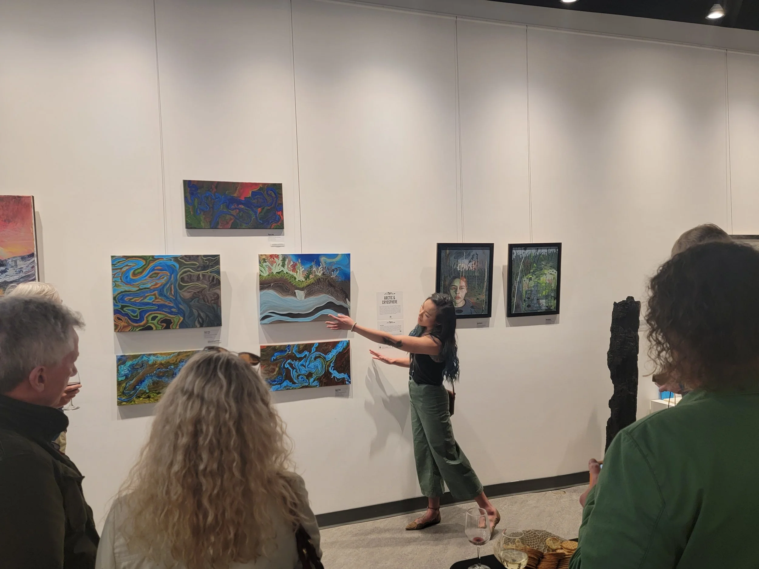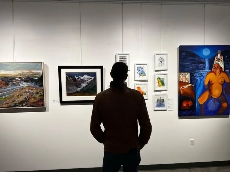 The Virtual Water Gallery went live with its first in-person exhibition from May 21 to June 17, 2022, at artsPlace in Canmore (AB). Alongside pieces from the Virtual Water Gallery, winning paintings from Rockies Repeat Youth Climate Challenge were exhibited. Several events were held in tandem with the VWG exhibit, including a public opening on May 25th and a VIP grand opening on June 3rd. During the opening events, artists and water experts shared their unique experiences and perspectives on the collaboration process to co-create the pieces exhibited. Patrick Cheechoo used humour in his presentation, performing a goose call and releasing the tension from a sober display of landscape affected by climate change.